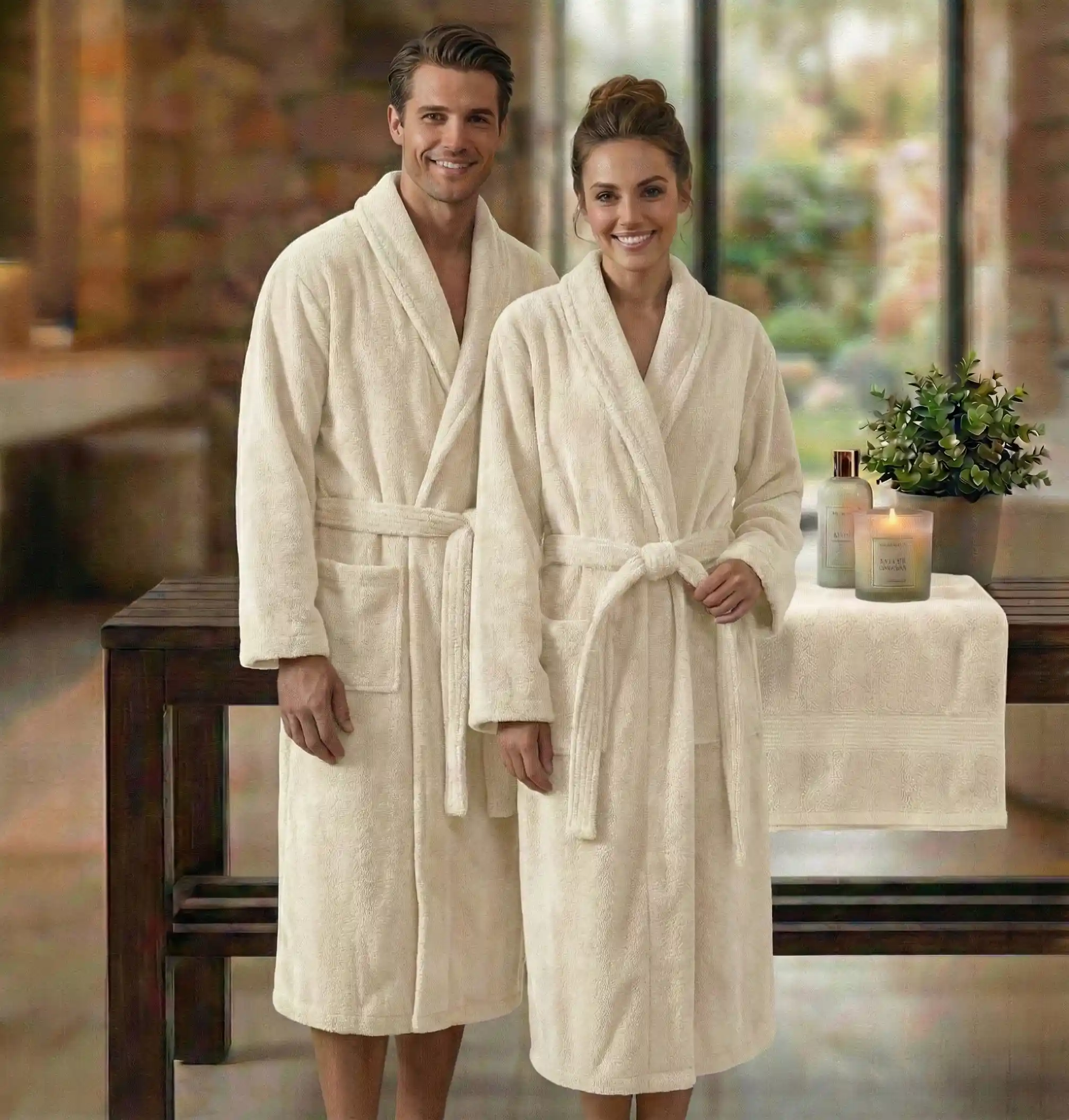 HALAT DE BAIE VELUR 100% BUMBAC (CREM) — halat de baie premium pentru hoteluri și SPA-uri. Fabricat din materiale de înaltă calitate, oferă confort maxim oaspeților. Ideal pentru unitățile HoReCa care doresc să impresioneze prin calitatea textilelor. Întreținere ușoară, rezistență la spălări industriale repetate.
